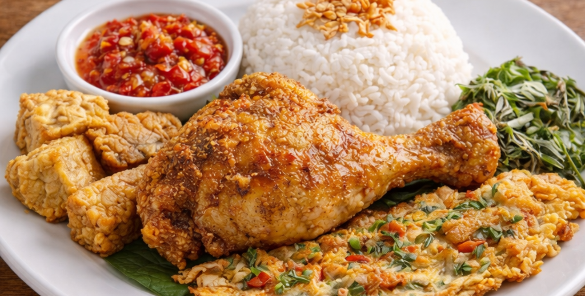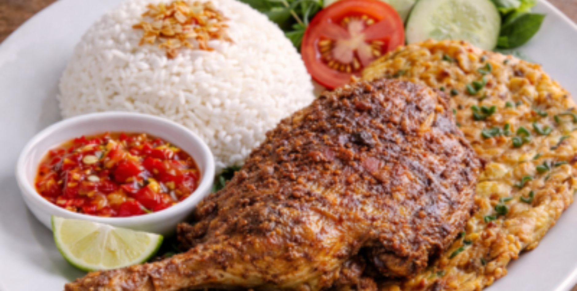 Nasi + Bebek/Paha + sambal + Jukut + Lalapan + telur dadar barendo